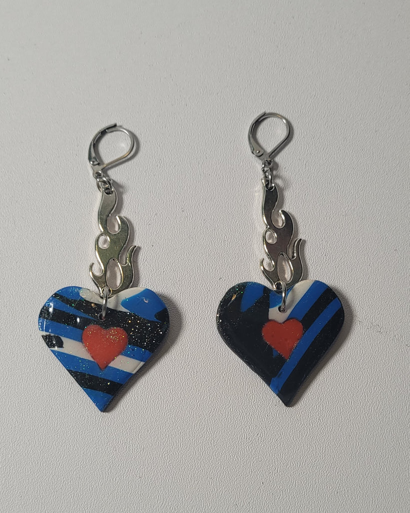 Material: Stainless steel earring post with a resin coated polymer clay heart with a silver alloy charm