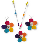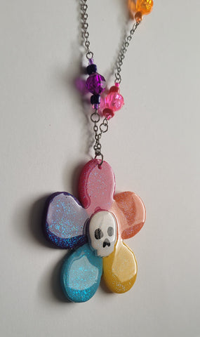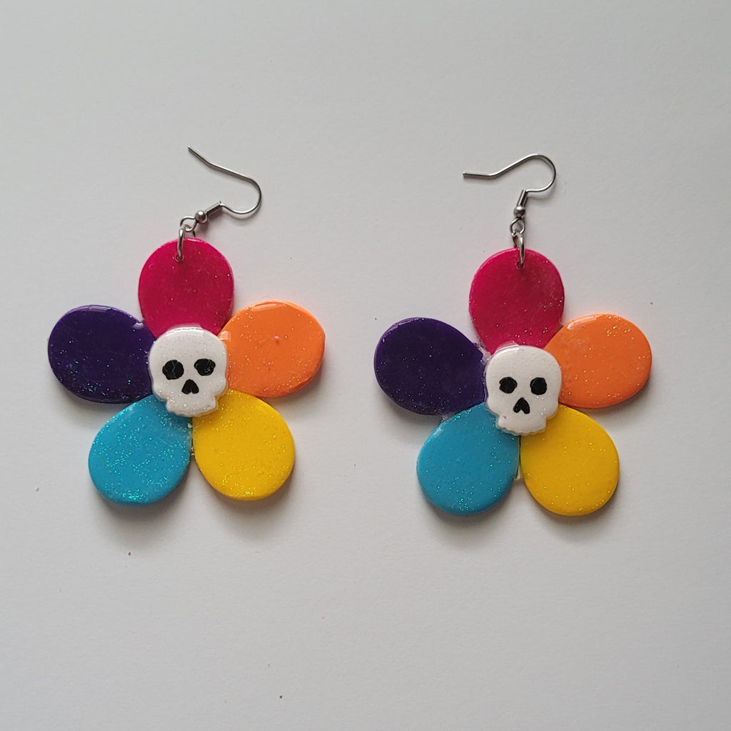 This skull jewelry is made from lightweight polymer clay and acrylic beads. Earrings measure 2.5 inches and are finished with stainless steel earring posts.