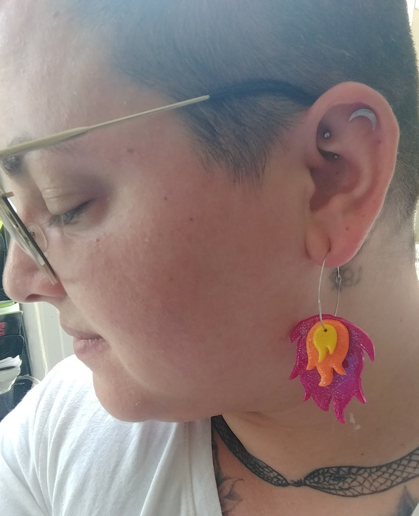 These earrings are made from lightweight polymer clay and stainless steel earring posts. They have a glossy glittered finished and measure 2 inches in length on a 1.5 inch hoop.