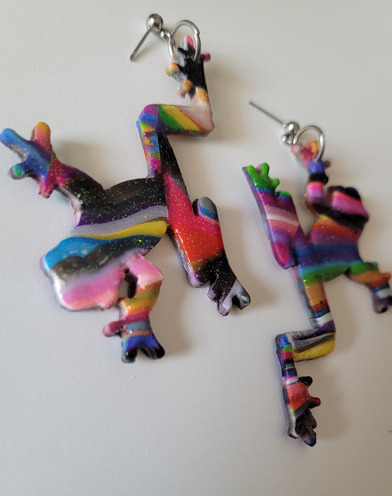 These earrings are made from polymer clay and stainless steel. They have a glossy glittered resin finish. Earrings measure 2.5 inches in length.